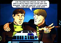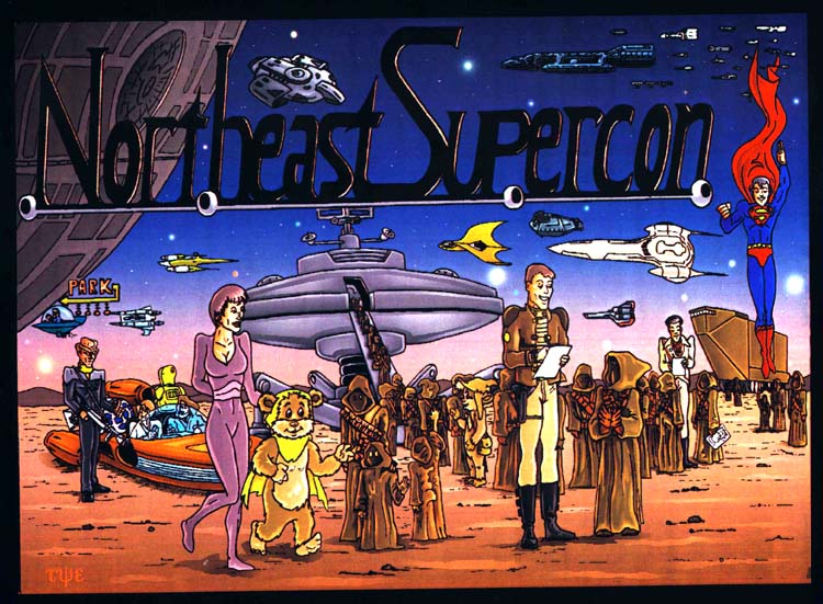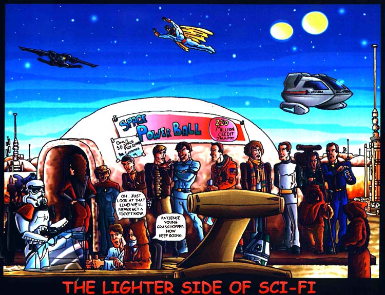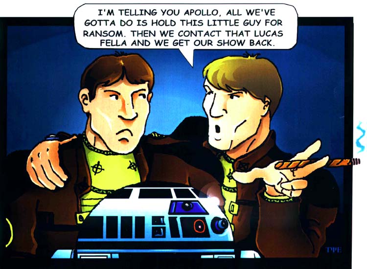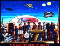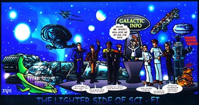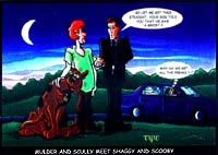 These images are from our featured artist Tye Bourdony - (TheLighterSide@Mindspring.com) from his "Lighter Side of Sci-Fi" collection. The first shot depicting Starbuck and Apollo discussing the revival was published in a recent Starlog magazine. The second features Scooby and Shaggy meeting Mulder and Scully and below that is the poster image he had made for