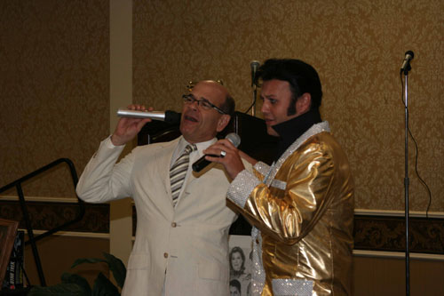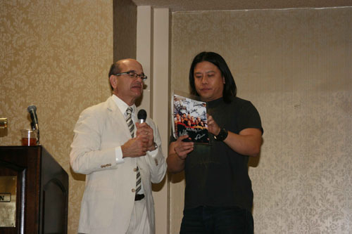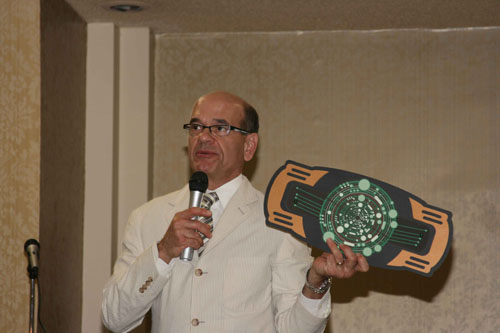![]() Robert Picardo speaking in front of Tyes satire gallery to the Charity event attendees. |